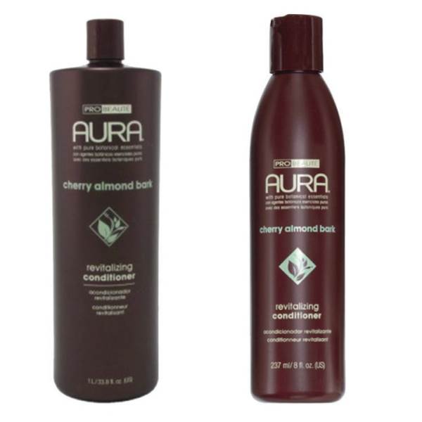 - Aura Cherry Almond Bark Conditioner, blended with natural agents derived from plants, improves texture and manageability