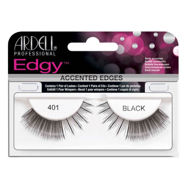 Ardell Edgy 401 Lashes are unique combination of a natural strip lash with an accented edge. Each style is designed with a tapered inside with an accentuated edgy flare on the outside to create a cat-eye glam look.