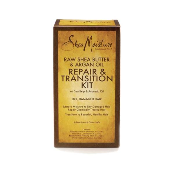 Our Raw Shea Butter & Argan Oil Repair & Transition Kit deeply moisturizes, strengthens and repairs while providing a protective barrier from environmental stressors. Formulations include certified organic Shea Butter, which moisturizes and nourishes with fatty acids and vitamins. Argan Oil, heralded for restoring shine, helps rebuild elasticity. Sea Kelp possesses mineral rich nutrition that seals and smoothes hair cuticles. Kit includes: - Deep Treatment Masque - Moisture Retention Shampoo - Restorative Conditioner - Reconstructive Finishing Elixir.