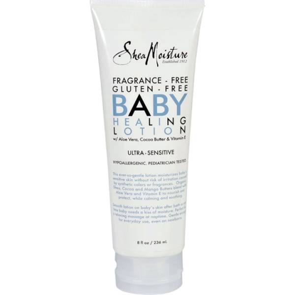 SheaMoisture’s Fragrance-Free, Gluten-Free Baby Healing Lotion moisturizes skin without the risk of irritation caused by synthetic colors and fragrances. Helps to nourish, protect baby’s sensitive skin while calming and soothing dry, irritated skin.