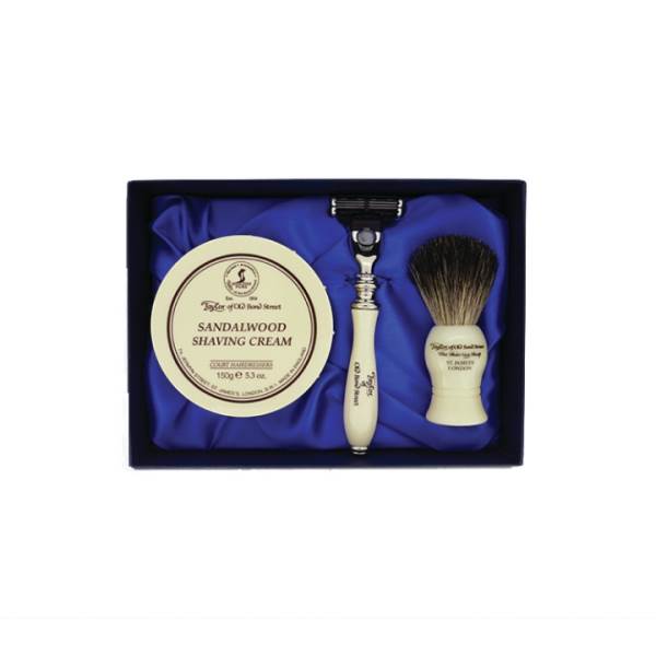 Sandalwood Shaving Cream Bowl 150g, (P1020) Pure Badger Shaving Brush and (15524) Victorian Imitation Ivory Handle Mach 3 Razor in Satin-lined Gift Box.