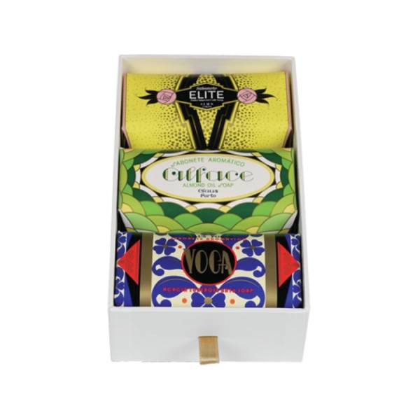 This Gift Box comes with 3 soaps of the Deco collection, Elite, Alface and Voga, each with a unique fragrance and personality. Blended with shea butter, these colorful soaps draw on the dramatic designs that first made Claus Porto’s name in the early 20th Century.