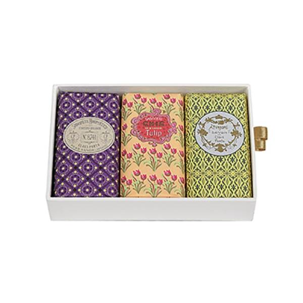 This Gift Box comes with 3 of the Classico soaps collection, Lavendre, 8741 and Chic, each with a unique fragrance and personality, giving a glimpse of the glamour of the Belle Époque era on which its wax-sealed packaging is based. A colorful and aromatic story that started in 1887 briefly told in this jewel box. Together, they offer an aromatic experience that goes from the traditional perfume of lavender, in the Lavendre soap, to the fruity and woody scent of 8741, finishing in the floral notes of Chic.