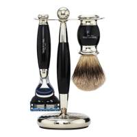 Truefitts' traditional shaving set comprising a matching brush, razor and stand. Available in four styles, Faux Ebony, Ivory, Blue Opal and Horn. Beautifully finished by hand with a perfectly balanced razor and hand made super badger shaving brush. Suitable for use with the standard Fusion blades respectively.