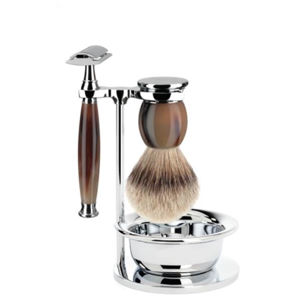 Genuine horn has been used to make useful or decorative objects since ancient times. The natural material must be selected and processed with great care: Only solid horn tips are used for the handles of shaving brushes and razors. If the hand-picked tips are sufficiently thick, they are formed meticulously by a turner. Then they are very finely ground several times and finally polished to a high-gloss finish.