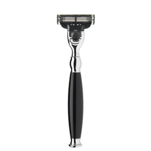 The Material - High-grade resin High-grade resin is a high-quality synthetic material, the surface of which is processed and refined separately. The material is ideal for exclusive accessories and writing implements because it facilitates a broad spectrum of modern and classical designs in many attractive colours. To begin with, the aesthetic basic shapes for brush and razor handles are turned out of solid rods. Then each individual work piece is polished in several passes to give the surface its special gleam. This processing method lends the models a pleasant feel and secures their beauty for many years to come. Without chrome the world would forfeit a lot of its lustre. In the finish used for our wet shaving accessories it demonstrates its best qualities: The material is corrosion-resistant, very long-lasting and has a luxurious, alluring lustre. When contrasted with this, the colours and shapes of other premium materials are shown to their very best advantage. The Razorhead - Gillette Mach3 The Gillette Mach3 system is one of the most frequently used shaving systems in the world. Three progressively spaced blades guarantee a comfortable and close shave. The blades are available from retailers everywhere. Wet shave razors from MÜHLE are compatible with the systems Gillette Mach3 and Mach3 Turbo.