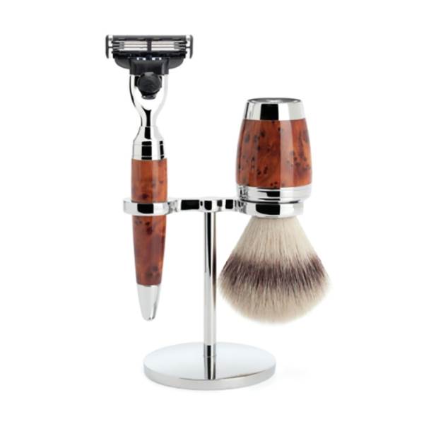 The Gillette Mach3 system is one of the most frequently used shaving systems in the world. Three progressively spaced blades guarantee a comfortable and close shave. The blades are available from retailers everywhere. Wet shave razors from MÜHLE are compatible with the systems Gillette Mach3 and Mach3 Turbo.