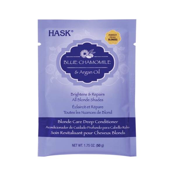 Bring back your color clarity with HASK Blue Chamomile & Argan Oil Blonde Care Deep Conditioner. This light blue violet treatment helps neutralize unwanted yellow tones and reduce brassiness. Formulated with blue chamomile to help lighten and boost blonde tones and argan oil to help repair and protect coarse blonde hair, leaving you with soft, silky locks. Together, these amazing ingredients help you stay true to your hue.