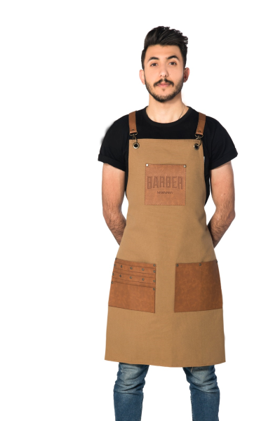 Marmara Barber apron comes with a unique set of pockets designed to hold all your favorite hair styling tools. Made with denim and synthetic leather. Beige/Brown.