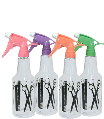 Clear PET bottle with the original trademarked black Shears and Comb graphic and assorted neon green, orange, purple, and pink Model 300 trigger sprayers.