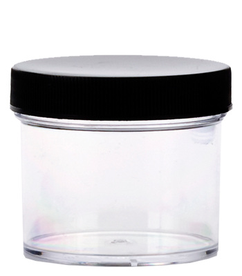 Clear plastic jar with black lid. Ideal for glitters and powders.