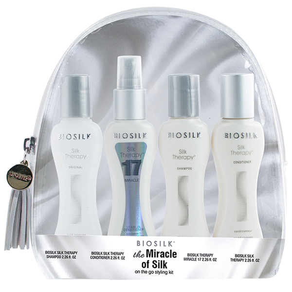 Provides unparalleled shine and revitalizes hair for soft, supple, and shiny results at all times with BioSilk Silk On the go styling kit. Includes: BioSilk Silk Therapy Original, BioSilk Silk Therapy Miracle 17 Leave-In, BioSilk Silk Therapy Shampoo, BioSilk Silk Therapy Conditioner
