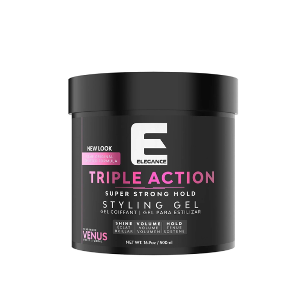 Elegance triple action hair gel provides a super strong hold, extreme volume, and attractive shine while providing a refreshing fragrance. This styling hair doesn't leave your hair oily or with residue. Triple action super strong hold hair gel can be used with all types of hair.