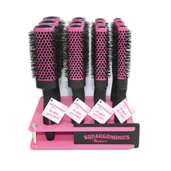 - Pink square barrel brushes with crimped bristles