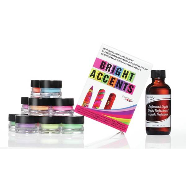 Bright Accents Acrylic Kit -Kit Includes: SuperNail Professional Liquid (29 mL / 1 fl oz) Sexy Shades (9.8 g / net wt 0.345 oz) Flirty Bikini (9.8 g / net wt 0.345 oz) Hey Lifeguard (9.8 g / net wt 0.345 oz) Jelly Sandals (9.8 g / net wt 0.345 oz) Tangerine Splash (9.8 g / net wt 0.345 oz) Bright Halter (9.8 g / net wt 0.345 oz)