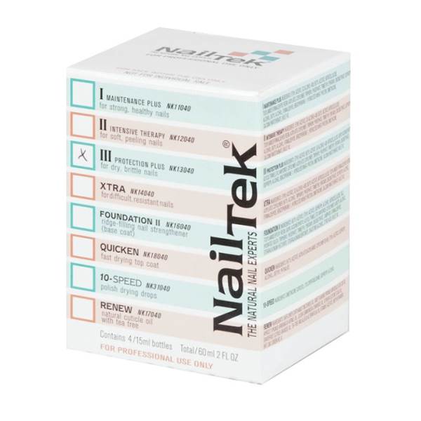 Nail Tek FORMULATION III provides extra conditioning for nails that are hard and brittle. This special formulation replenishes the natural moisture content of the nail. Applied daily, Protection Plus helps nails regain the healthy balance necessary to resist stress and enhance survivability.