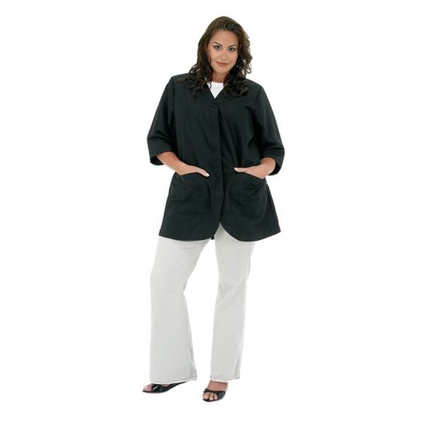 A Size Above is a stylish collection of plus size / big & tall salon and barber apparel that actually fits! We at Betty Dain are proud to be the first to fulfill the need for expanded sizing without compromising looks, fit, or comfort. With a wide selection of vests, capes, jackets and more, stylists and clients alike will enjoy A Size Above's apparel options specifically designed to flatter a fuller figure. The Women's Stylist Jacket features 3/4 length sleeves, a button down front, and two lower pockets. The fabric is a lightweight nylon/poly blend that is water resistant and easy to clean. Machine washable.
